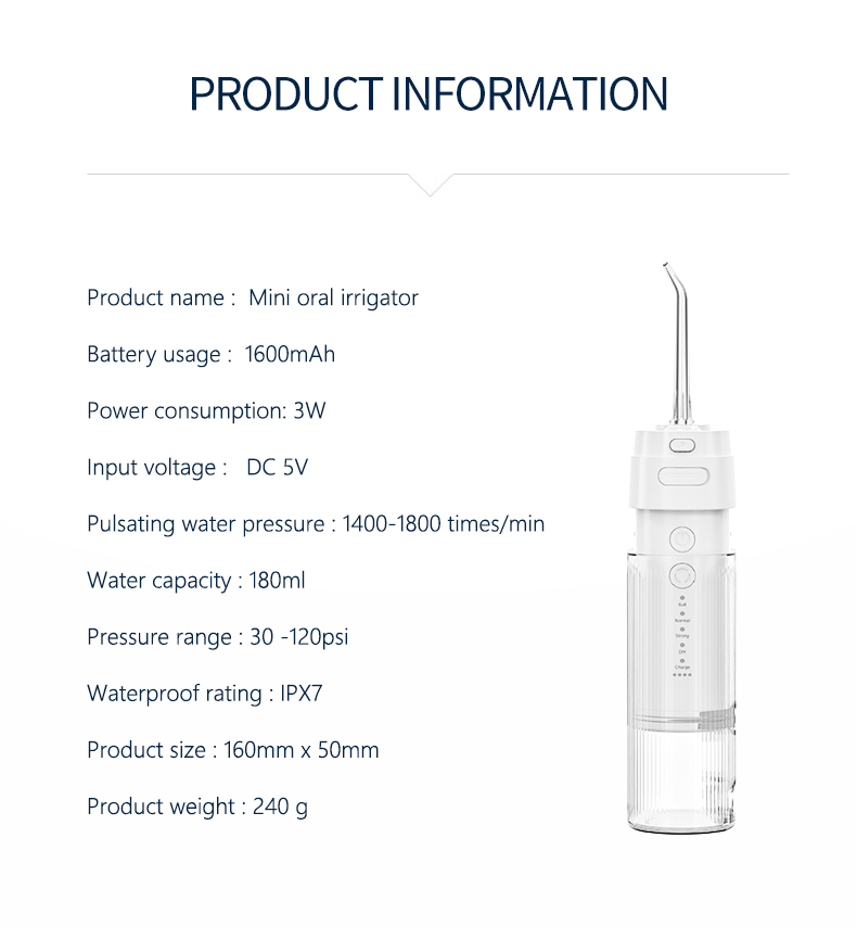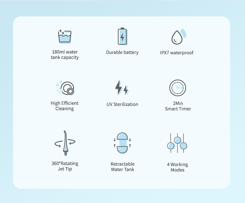 Tăm tăm nha khoa bằng nước này tạo ra xung áp suất nước cao ở mức 1400-1800 lần mỗi phút, loại bỏ hiệu quả 99,9% mảng bám răng để làm sạch sâu răng. Tăm tăm nha khoa bằng nước này massage nướu, thúc đẩy lưu thông máu và giải quyết các vấn đề về răng miệng như hôi miệng, răng chỉnh nha
