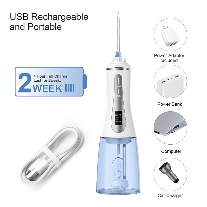 Máy tăm nước nha khoa này tự hào có thời lượng pin gấp đôi so với các loại khác nhờ pin mạnh mẽ, thân thiện với môi trường. Chỉ cần sạc trong 3 giờ và tận hưởng 30 ngày sử dụng. Nó nhỏ gọn và nhẹ, hoàn hảo để sử dụng tại nhà và khi di chuyển. Dụng cụ nha khoa dưới nước này đi kèm với cáp USB (không bao gồm bộ chuyển đổi) khiến nó trở thành một bộ dụng cụ du lịch lý tưởng. Hưởng lợi từ thời lượng pin đặc biệt dài 30 ngày, biến nó thành một giải pháp thực sự di động để thuận tiện cho bạn