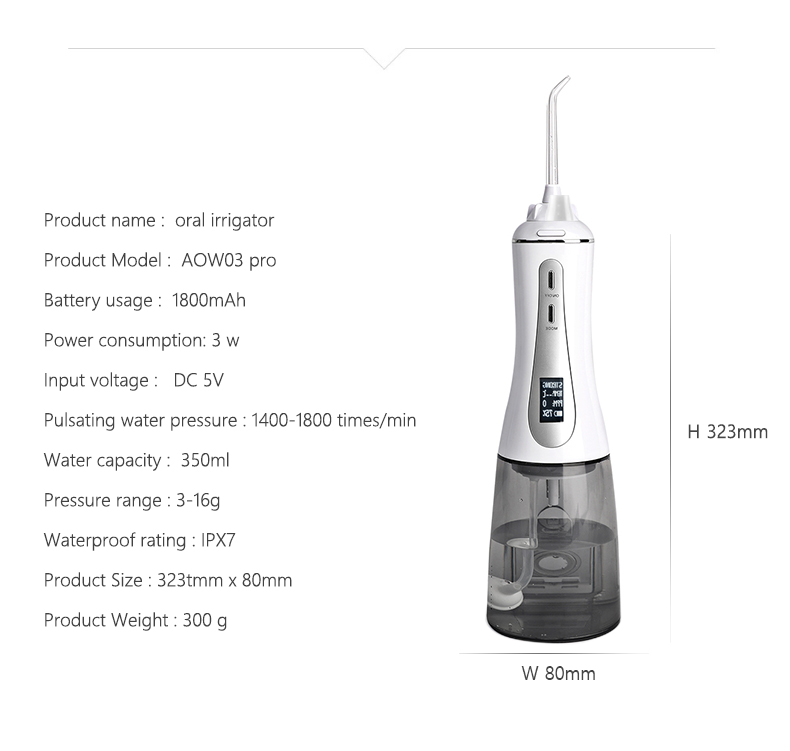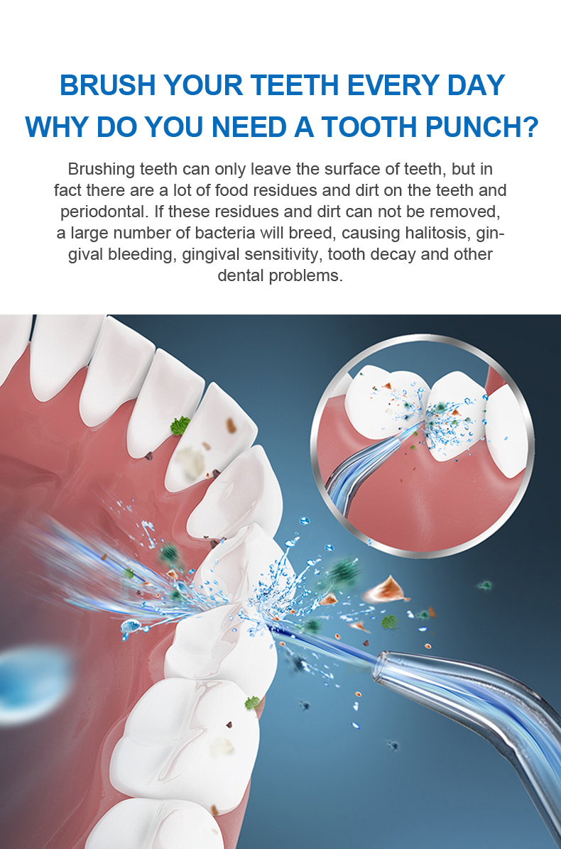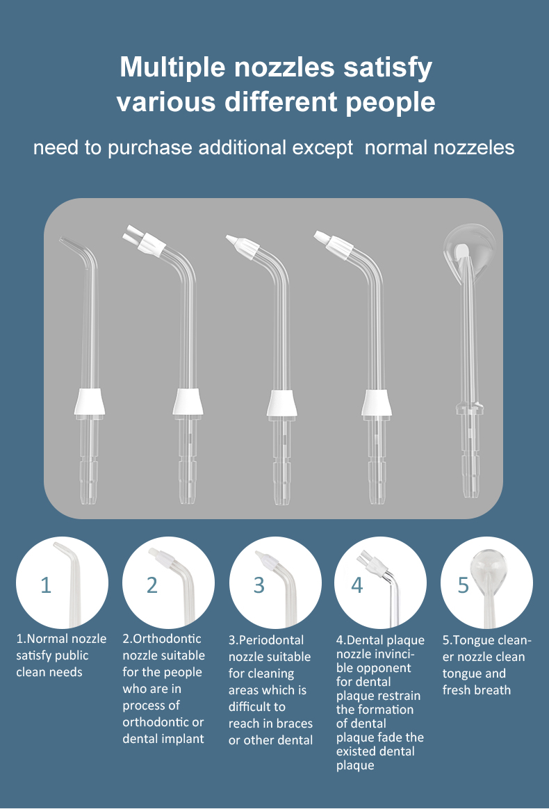 Dụng cụ nha khoa bằng nước này cung cấp xung áp lực nước cao ở mức 1400-1800 lần mỗi phút, loại bỏ hiệu quả 99,9% mảng bám răng để làm sạch sâu răng. Dụng cụ nha khoa bằng nước này mát xa nướu, thúc đẩy lưu thông máu và giải quyết các vấn đề về răng miệng như hôi miệng, chỉnh răng