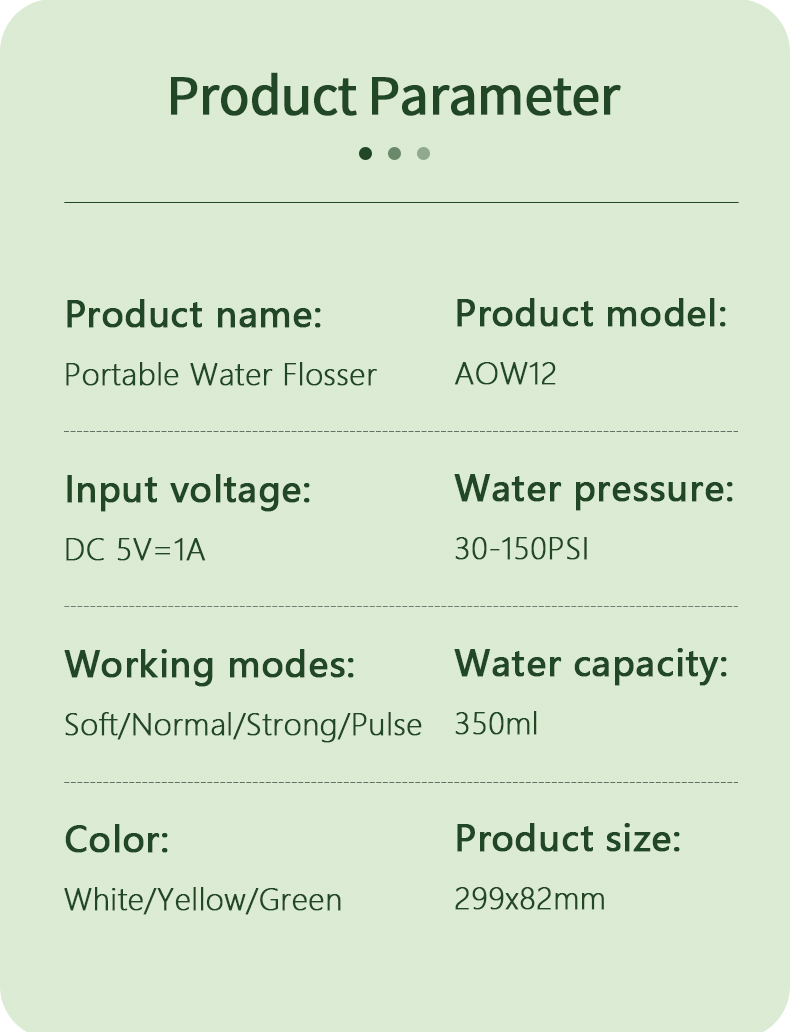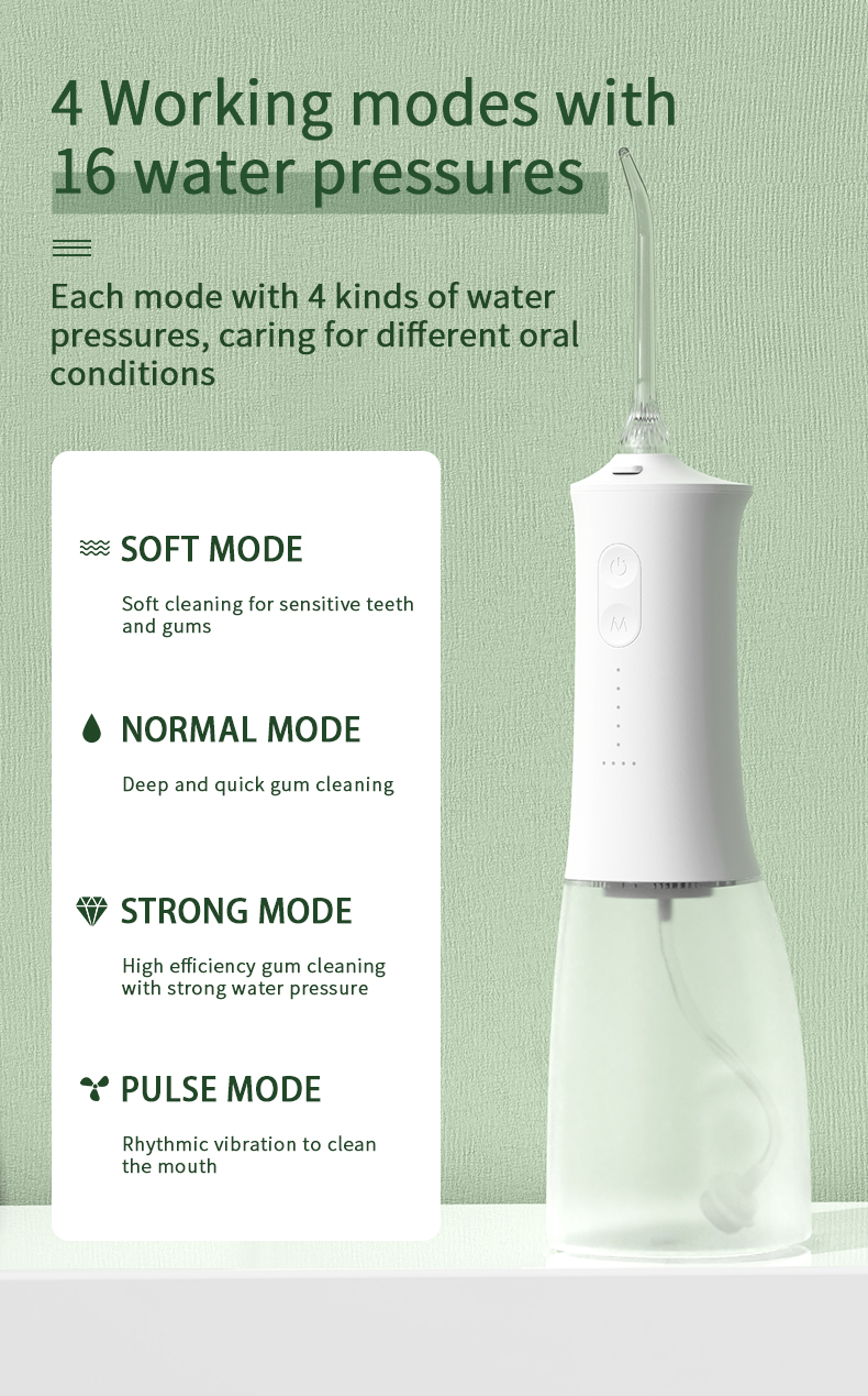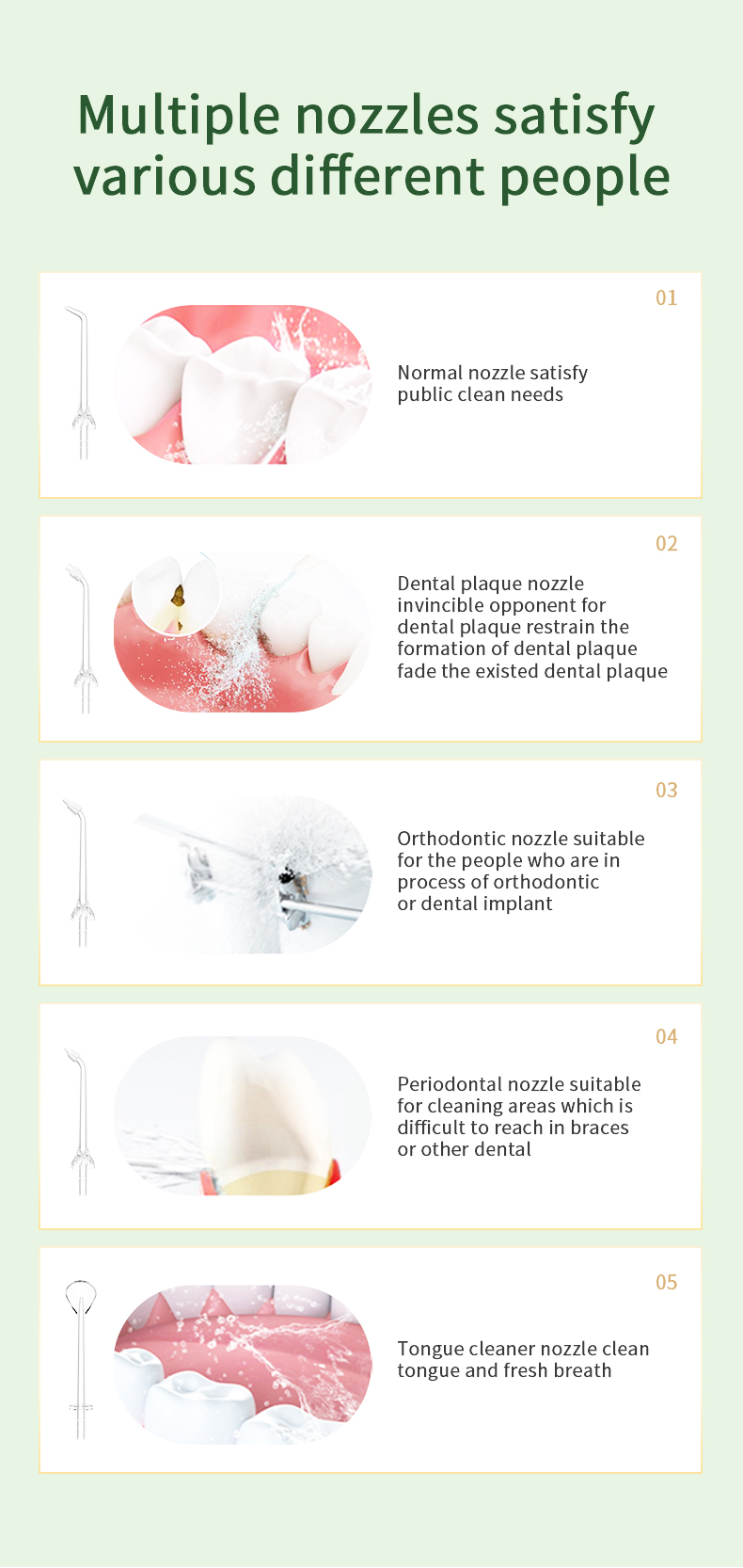 Dụng cụ nha khoa bằng nước này cung cấp xung áp lực nước cao ở mức 1400-1800 lần mỗi phút, loại bỏ hiệu quả 99,9% mảng bám răng để làm sạch sâu răng. Dụng cụ nha khoa bằng nước này mát xa nướu, thúc đẩy lưu thông máu và giải quyết các vấn đề về răng miệng như hôi miệng, chỉnh răng