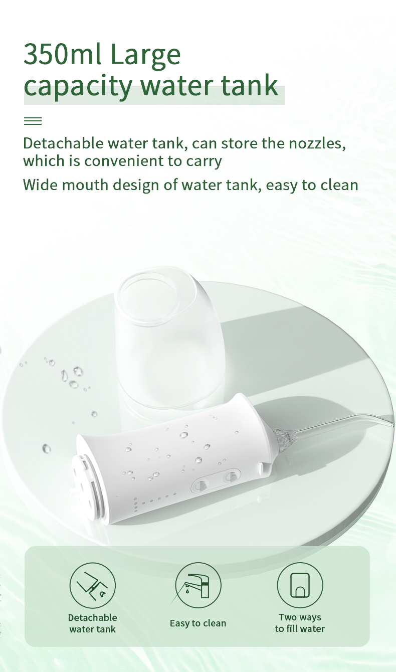 Máy tăm nước nha khoa này có bình chứa nước 350ml được nâng cấp, dung tích gấp đôi so với các mẫu cũ khác, loại bỏ nhu cầu châm thêm nước thường xuyên và giúp việc vệ sinh răng miệng của bạn thuận tiện và hiệu quả hơn