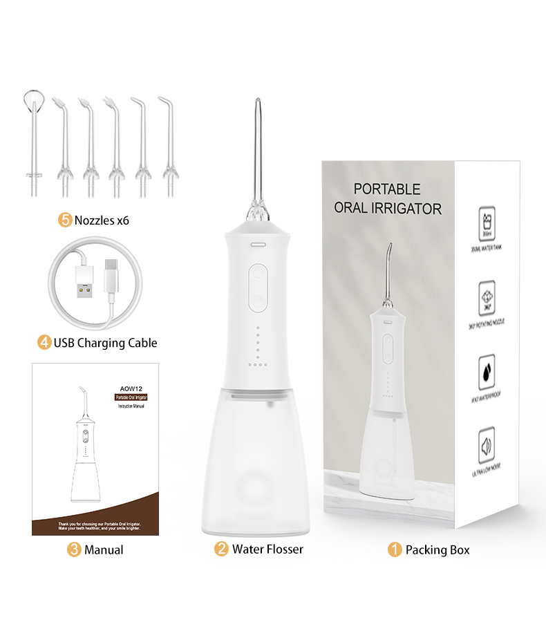 Gói hàng bao gồm: 1 thân máy tăm nước + 5 đầu tăm + 1 cáp USB + 1 hướng dẫn sử dụng + 1 hộp quà tặng.